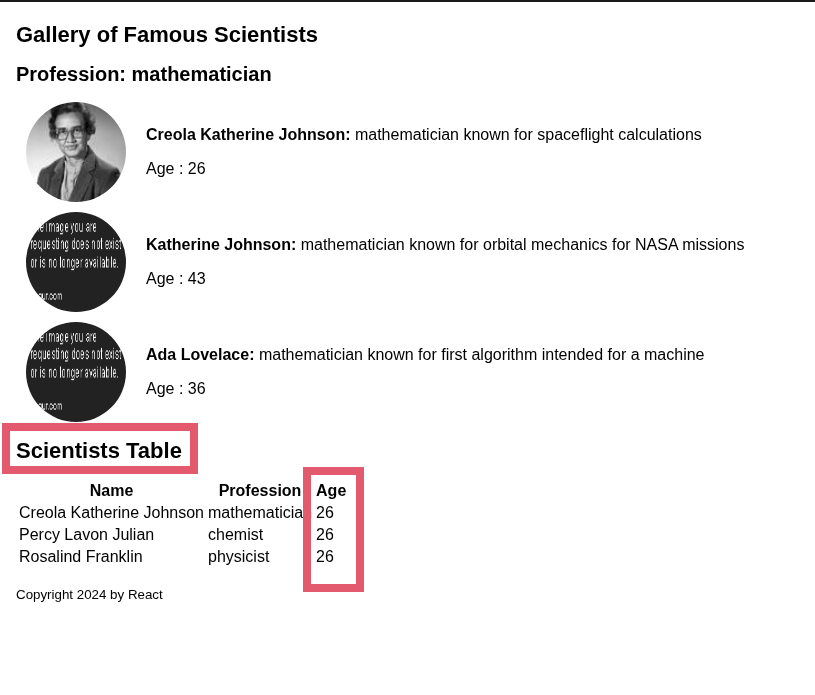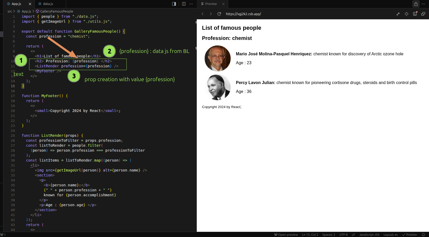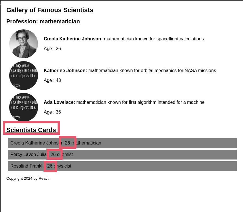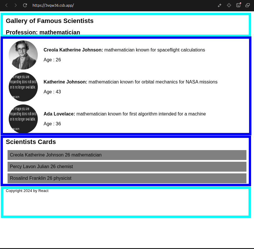 - React Principles - Gallery Scientist: codesandbox - Gallery Scientist 2: codesandbox - Gallery Scientist 3: codesandbox - Describing the UI - Passing Props - Conditional render - Rendering lists ![]() |