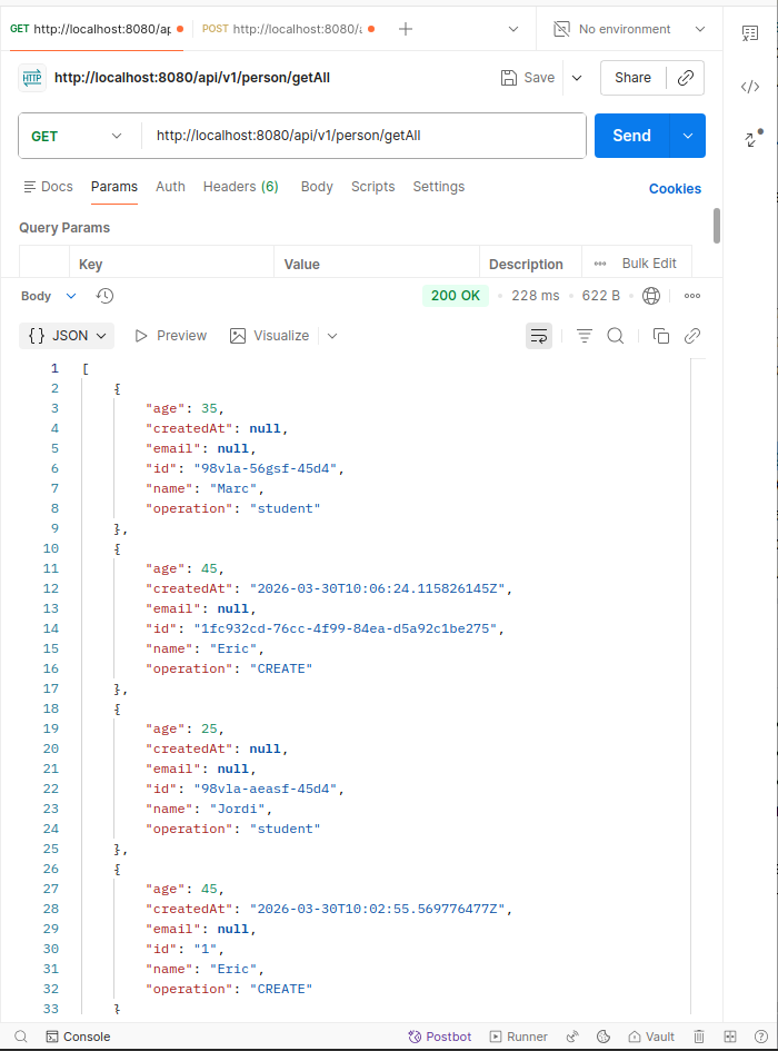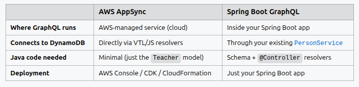 | #18 | 59 | 13/04/2026 | - Spring Boot AWS personNoSQL Sandbox: (1) noSql: pK and sK (2) Teacher / Student /Person document/item (gsheet) (3) noSqlPerson how to relate items? Pk? Social Club? Programming courses? Catalonia elementary schools?(4) Defining unique-table (5) Spring Boot graphQL (6) Test with GraphiQL Playground / Postman ++ Microservices or Monolith ? Modulith |