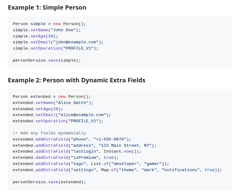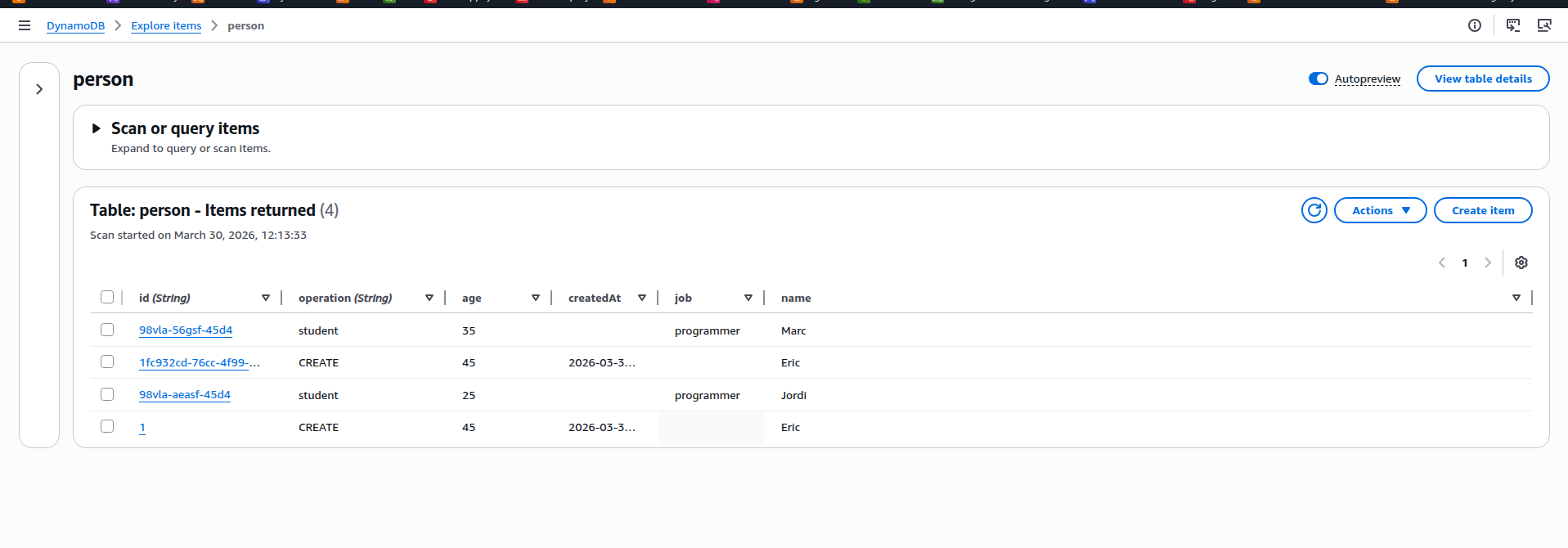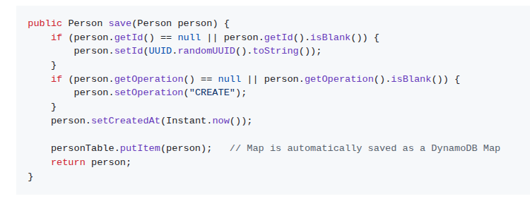 - noSqlPerson: ca8baa - noSqlPerson: 49fc58 - SpreadSheet NoSql Renovations - Java 2.x: DynamoDB Enhanced Client - Map Java objects - putItem - DynamoDB examples using SDK for Java 2.x: putItem - dynamoDB-enhanced - dynamoDB-enhanced: ommon-primitive-operations Postman ![]() |