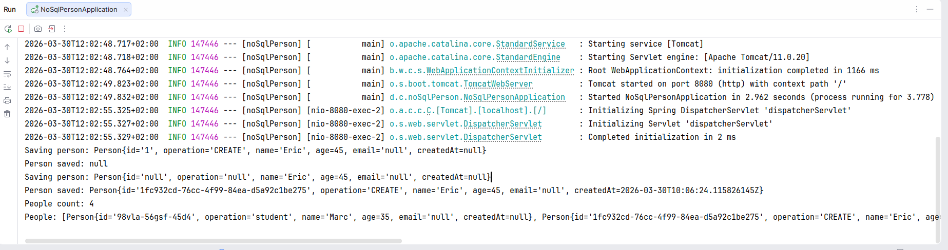| #16 | 55 | 30/03/2026 | - Spring Boot: DynamoDB SDK v2.x dependency (1) noSql: pK and sK (2) Renovations/Person document (3) Enhanced client (4) noSqlPerson project - AWS dynamoDB: (1) create account (2) create table, pk and sk (3) root keys and save them (4) local cli aws configure |