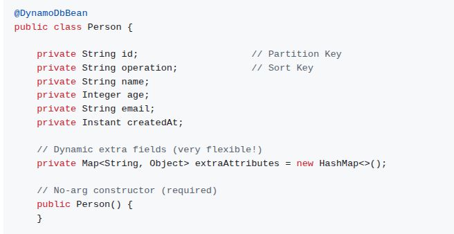 | 56 | 31/03/2026 | - Java Spring Boot: (0) ApartmentPrediction_masterDoc: v7 (1) Renovation domain - Spring Boot AWS personNoSQL Sandbox: (0) DynamoDB SDK v2.x dependency (1) noSql: pK and sK (2) Renovations/Person document/item (gsheet) (3) Enhanced client (4) noSqlPerson project (5) map field depending on sortkey (6) Map<String, Object> extraAttributes |