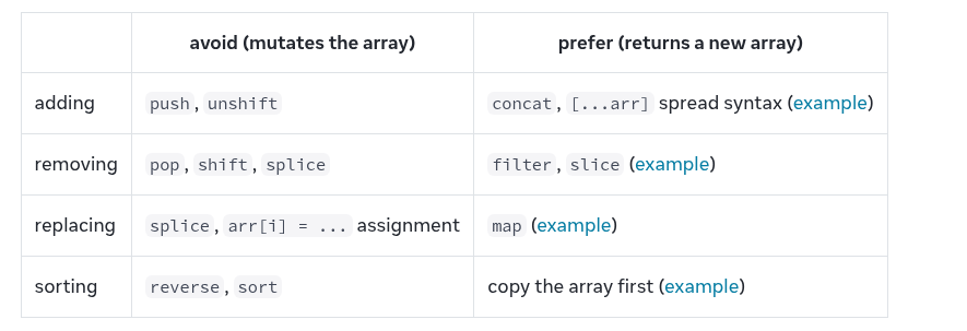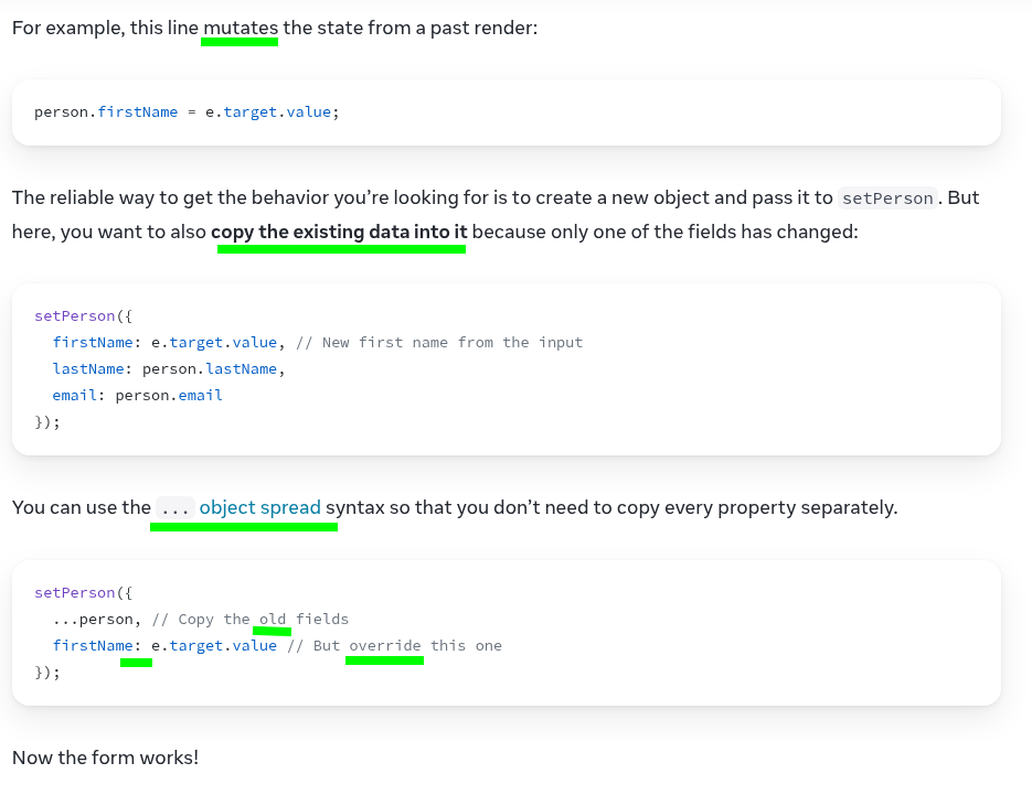 - React Principles - Describing the UI - Adding Interactivity - TrafficLights - basicRegisterForm - Copying objects with the spread syntax - Updating Arrays in State |